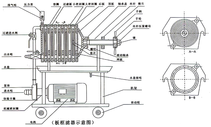 板框過濾器使用須知:1、使用前注射水消毒。2、將濾材用蒸餾水浸濕后貼在網板上,再壓緊頂板。3、啟動前先把泵內加滿液體,再關閉進液泵,然后啟動,逐漸打開液閥,并打開排氣閥排出機內空氣。4、關閉時先關閉進液閥,再關機,防止突然停止液體回流擊環(huán)濾材。