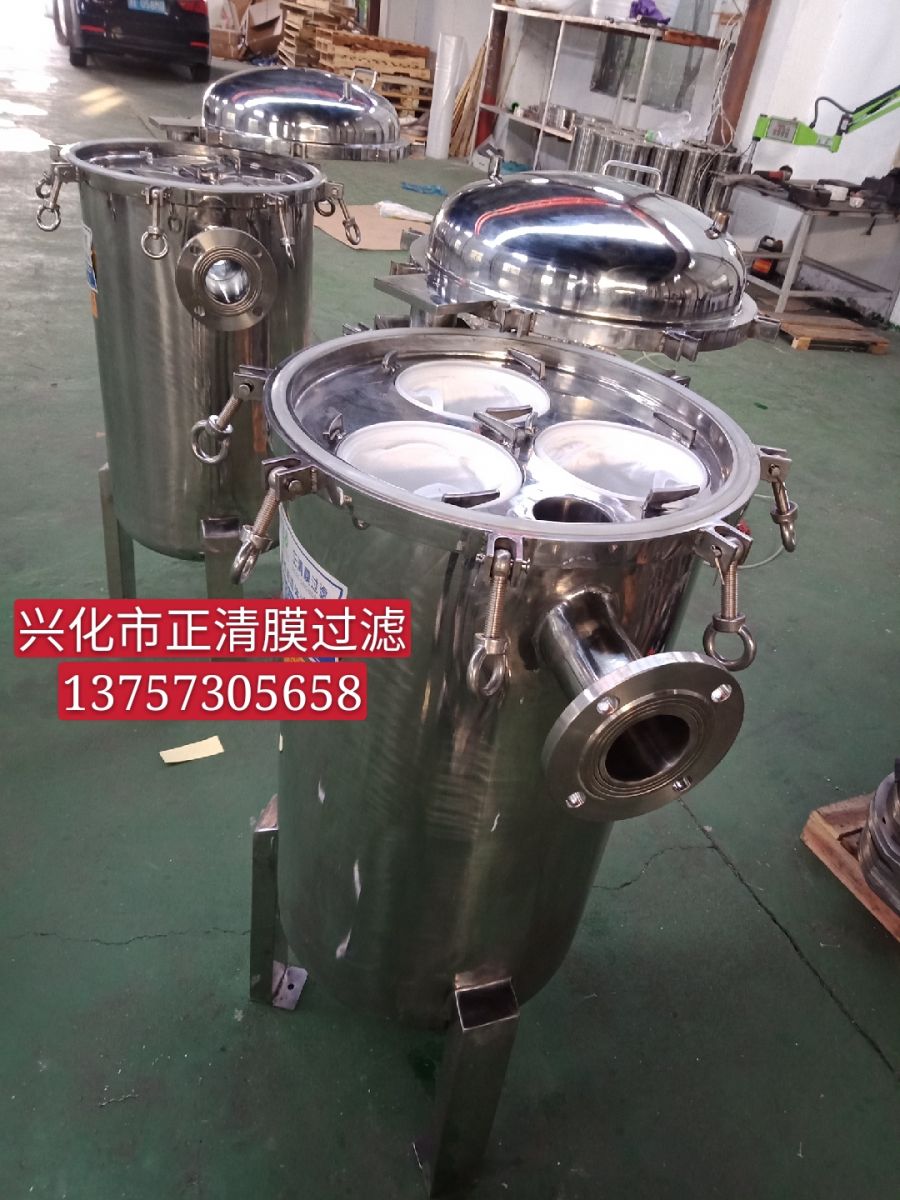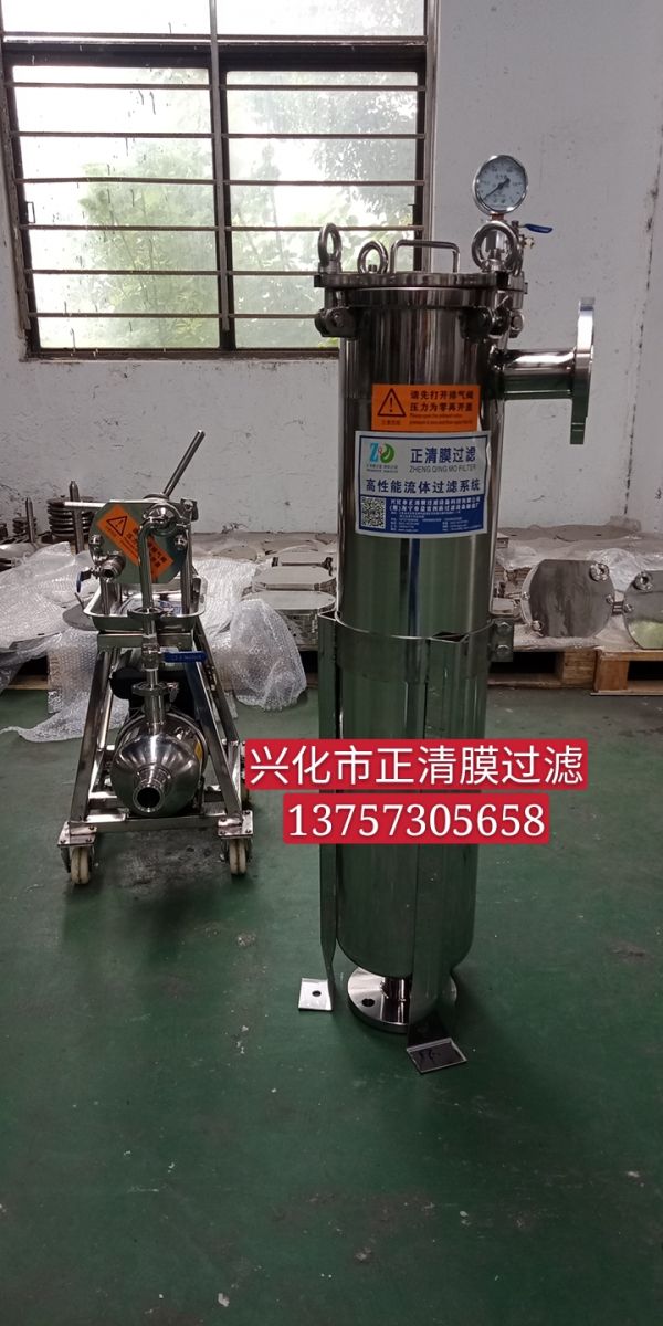 夾套保溫袋式過濾器,過濾機(jī)是一種壓力式過濾裝置,主要有過濾筒體、過濾筒蓋和快開機(jī)構(gòu)、不銹鋼濾袋加強(qiáng)網(wǎng)等主要部件組成,濾液由過濾機(jī)外殼的旁側(cè)入口管流入濾袋,濾袋本身是裝置在加強(qiáng)網(wǎng)籃內(nèi),液體滲透過所需要細(xì)度等級(jí)的濾袋即能獲得合格的濾液,雜質(zhì)顆粒被濾袋攔截。該機(jī)更換濾袋十分方便,過濾基本無物料消耗。