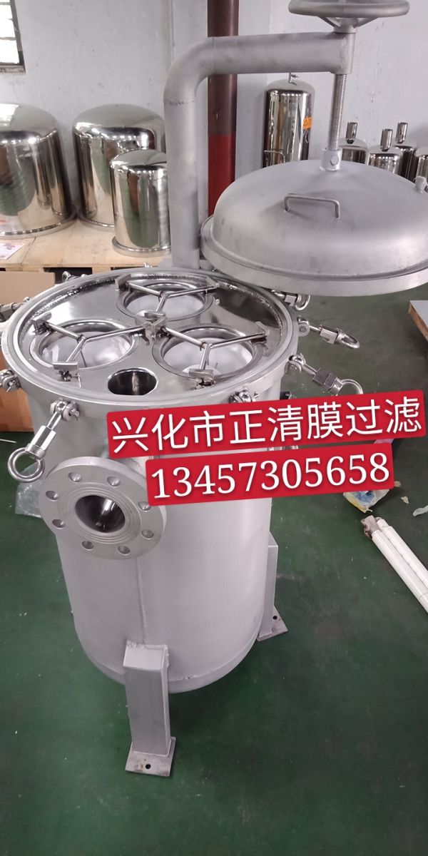 袋式過濾機(jī)是一種結(jié)構(gòu)新穎、體積小、操作簡便靈活、節(jié)能、高效、密閉工作、適用性強(qiáng)的多用途過濾設(shè)備。 袋式過濾機(jī)是一種壓力式過濾裝置,主要有過濾筒體、過濾筒蓋和快開機(jī)構(gòu)、不銹鋼濾袋加強(qiáng)網(wǎng)等主要部件組成,濾液由過濾機(jī)外殼的旁側(cè)入口管流入濾袋,濾袋本身是裝置在加強(qiáng)網(wǎng)籃內(nèi),液體滲透過所需要細(xì)度等級(jí)的濾袋即能獲得合格的濾液,雜質(zhì)顆粒被濾袋攔截。該機(jī)更換濾袋十分方便,過濾基本無物料消耗。